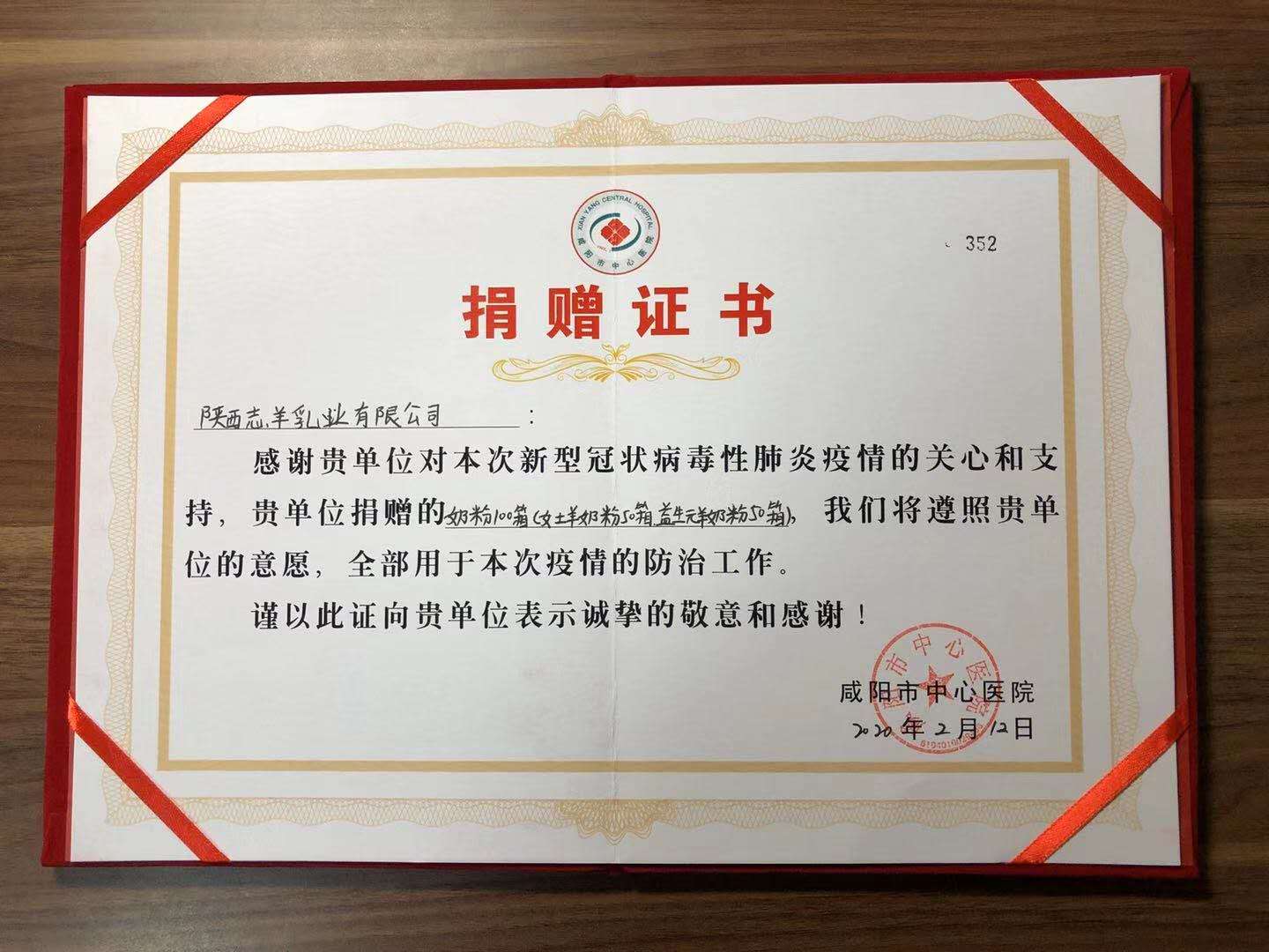 通過聯(lián)系省紅十字會,我們聯(lián)系到咸陽主要承擔(dān)“新冠”患者救治任務(wù)的咸陽市中心醫(yī)院,于2020年2月12日向該醫(yī)院捐贈價值38萬余元的羊奶粉,用于醫(yī)護(hù)工作者營養(yǎng)補充,讓他們在一線緊張的抗疫救治工作中,及時補充營養(yǎng),提升身體免疫力。
